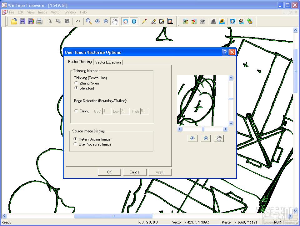 WinTopo是一款可将光栅图(RasterImage)转换成矢量(Vector)图形的工具。WinTopo的主要功能是将光栅图像中的单线和多条线转换成相应的矢量图形。此程序可转换扫描的地质图或者工程绘图。转换后的矢量图形可用于AutoCAD和IntelliCAD等CAD工具软件。主要功能包括:输入高达24位RGB格式位图及TIFF,GIF,JPEG等格式的图像文件;将光栅图矢量化为彩色线条图;支持多种文件格式输出,如ARC、DXF、Mapinfo、MIF、TXT;可根据需要使用一键矢量化(快速)或精确矢量化。